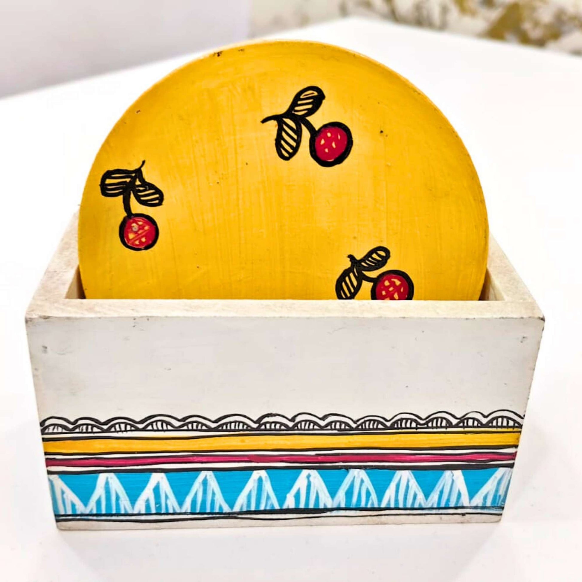Handcrafted Wooden Coaster Set with Holder | Madhubani Folk Art Design
