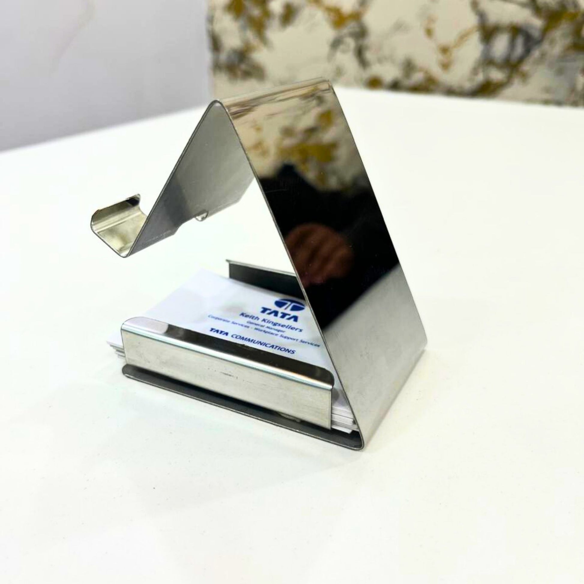 Add a clean, professional touch to your desk with this stainless steel mobile stand with visiting card holder. Designed for hands-free phone use, it securely holds your smartphone while neatly organising business cards or visiting cards in the built-in holder.